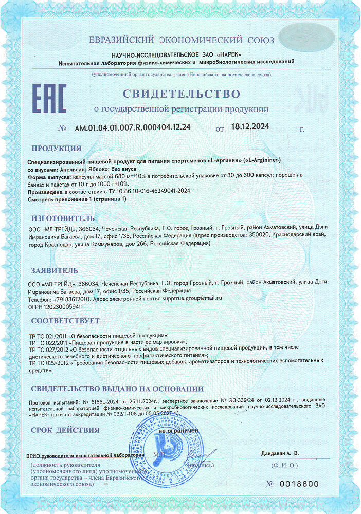 L-Аргинин, желатин (оболочка капсулы), микрокристаллическая целлюлоза (носитель)