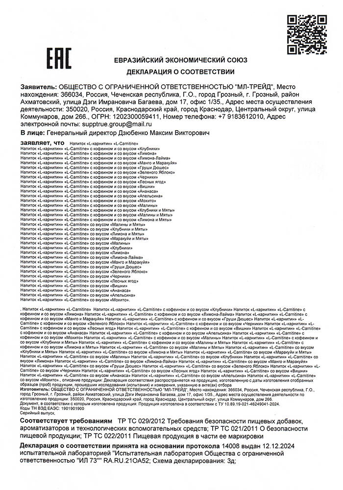 Вода подготовленная; L-карнитин; подсластитель мультимикс; ароматизатор пищевой; цитрат натрия; карбоксмиметилцеллюлоза; кармин; сорбат калия; бензоат натрия