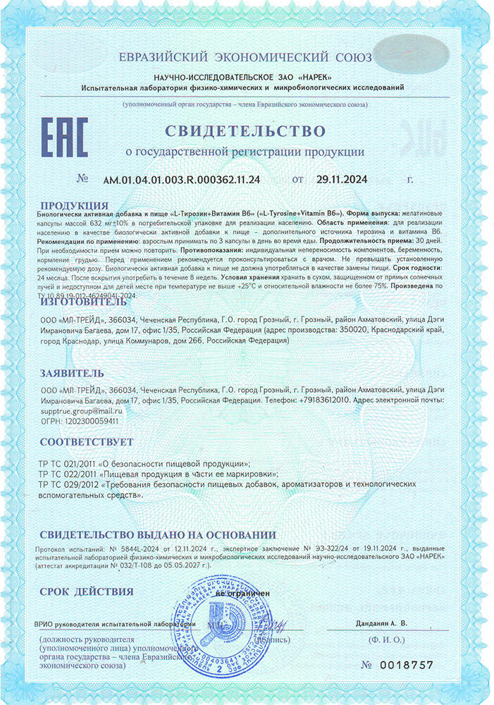 Тирозин — это аминокислота, используемая клетками организма для выработки белков и производства ряда биологически активных веществ: дофамина, норадреналина и адреналина. Эти вещества поддерживают умственную и физическую работоспособность, повышают концентрацию внимания, поднимают настроение, улучшают тонус сосудов, укрепляют сердечную мышцу.